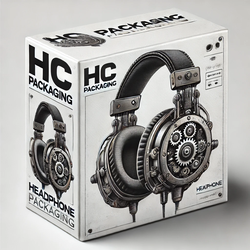 Empaquetado de auriculares con temática industrial personalizado con diseño metálico y mecánico